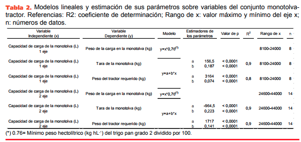 A través de la información disponible de los fabricantes nacionales e internacionales de cosechadoras de granos fue realizado un relevamiento de sus características. Entre ellas, potencia del motor (HP) (*), peso sin cabezal con tolva vacía y sin combustible (kg), ancho (m) y peso de cabezal (kg) sojero y maicero. También, se relevó la capacidad de carga (L) de las monotolvas de un eje y dos ejes y su respectivo peso de carga con un peso hectolítrico de 76 kg hL-1 (mínimo peso hectolítrico para trigo pan grado 2), además de su tara (kg). Agregado a ello, el peso (kg) del tractor requerido para el arrastre de las mismas.