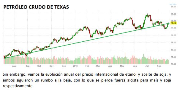 Tener certeza de grandes cosechas desde Estados Unidos, y alto stock final 17/18, presiona a la baja, mientras en USA la Agencia de Protección Ambiental (EPA) no ha mostrado firmeza en sus decisiones, respecto de elevar la tasa de corte de combustibles fósiles, con biocombustibles. Esto quita fuerza alcista que podría tener una suba del petróleo hacia los biocombustibles.