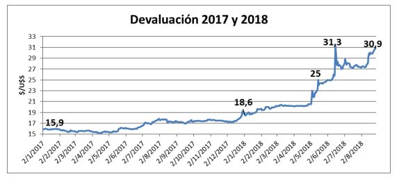 - Por último, tenemos el tipo de cambio local, que sigue enrareciendo el clima de negocios en nuestro país. El PESO se sigue devaluando, los costos se licuan, pero los precios de granos en PESOS no suben y por ende bajan en Dólares. Esto hace que necesariamente debamos seguir paso a paso la evolución del tipo de cambio, ligado a la venta de granos y compra de insumos.Veamos la escalada del Dólar entre 2017 y 2018, si consideramos el tipo de cambio a principios de año, en U$S 18,6/U$S, y el cierre de este viernes, en $30,9/U$S, tenemos hasta ahora una devaluación del 66%, y un cuatrimestre por delante para terminar el 2018.