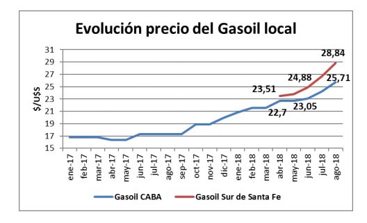 En el siguiente gráfico, puede verse la escalada de precios del litro de gasoil, según YPF para Capital Federal. Vemos además que la suba de precios en el interior, en este ejemplo, para el sur de Santa Fe, se despega ampliamente de la curva de subas respecto a Capital Federal.