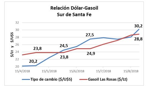 Vemos día a día el impacto del tipo de cambio sobre la baja de precios en nuestros granos, pero veamos el impacto que tiene sobre el combustible base de la actividad agropecuaria, el gasoil.