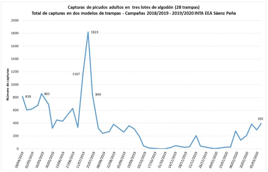 Entre el 06 de agosto y el 8 de octubre de 2019 (previo a la siembra de la campaña 2019/20) las capturas semanales de 25 trampas instaladas en la EEA Sáenz Peña, arrojaron un promedio de casi 10 P/T/S (picudos por trampa por semana). Este panorama obligaba desde entonces a permanecer alerta en cada etapa del cultivo de algodón de esa campaña 19/20, atendiendo cuidadosamente a los registros de trampas de feromonas al principio (etapa vegetativa) y al monitoreo de órganos fructíferos sobre plantas en el lote, después, todo esto para decidir oportunamente las más adecuadas acciones de control.