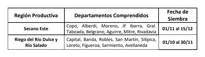 La EEA-INTA Santiago del Estero cuenta con numerosos años de experiencia con diferentes fechas de siembra entre los meses de septiembre y diciembre, inclusive experimentando con diferentes cultivares y distanciamientos que justifican, no solo el período de siembra aconsejado para áreas de riego y secano, sino también el adelantamiento en las áreas bajo riego (Mondino y Koritko, 2017). Se proponen en la tabla que se adjunta las fechas de siembra para las diferentes regiones productoras de algodón de Santiago del Estero.