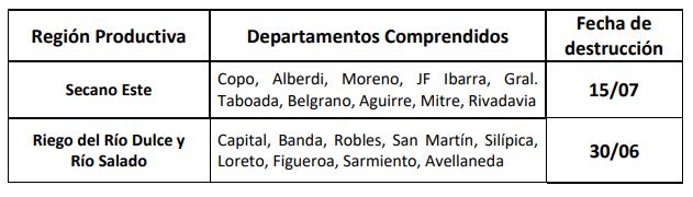 No obstante la fecha fijada como último día para la destrucción del rastrojo en la región considerada, es aconsejable que dentro de cada lote de algodón se recomiende la realización de la misma en forma inmediata a la cosecha o en su defecto, en un período no superior a los 15 días posteriores a su finalización, por considerarse esta operación un momento estratégico para el control de las poblaciones del picudo del algodonero que abandonan el cultivo hacia sus áreas de refugio. Se proponen en la siguiente tabla el último día autorizado para la destrucción del rastrojo para las diferentes regiones productoras de algodón de Santiago del Estero, aumentando en 15 días la fecha para las áreas de riego.