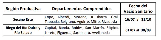 A mi criterio en una nueva legislación nacional debería sustituirse en dicho artículo la frase final “de forma tal que se asegure la muerte de la planta” por la frase “de forma tal que se asegure la ausencia en el lote de plantas con riesgo fitosanitario”. Se entiende por vacío sanitario al período de tiempo libre de plantas de algodón con riesgo fitosanitario. Comienza el día de la finalización de la destrucción del rastrojo y termina el primer día de la fecha de siembra para la zona provincial o región considerada. Si bien su duración debería ser lo máximo posible, se establece un período mínimo de 90 días de vacío sanitario. En la siguiente tabla se propone el período de duración del vacío sanitario para las diferentes regiones productoras de algodón de Santiago del Estero.