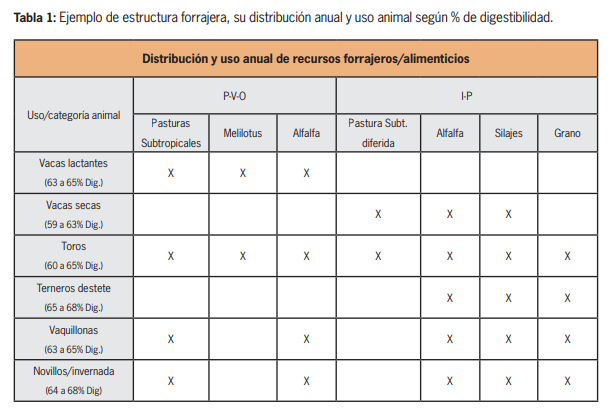 Con el objetivo de lograr una mayor interpretación de lo expuesto se esquematiza una situación de presupuesto forrajero (mediano plazo) a través de un ejemplo para un sistema de ciclo completo. El primer paso en la organización del trabajo es conocer la estructura forrajera del establecimiento y su distribución estacional. De la misma manera, planificar su uso en el tiempo, según los requerimientos nutricionales de las diferentes categorías animales y objetivos empresariales del productor. La composición y productividad de esta estructura siempre presenta una fuerte influencia ambiental del lugar y las condiciones climáticas del año en cuestión. En este sentido, para el análisis se considera un ejemplo con base forrajera de pasturas megatérmicas y alfalfa, con incorporaciones anuales de melilotus y cultivos de verano (sorgo y/o maíz) para confección de silajes o producción de granos para la alimentación (tabla 1).