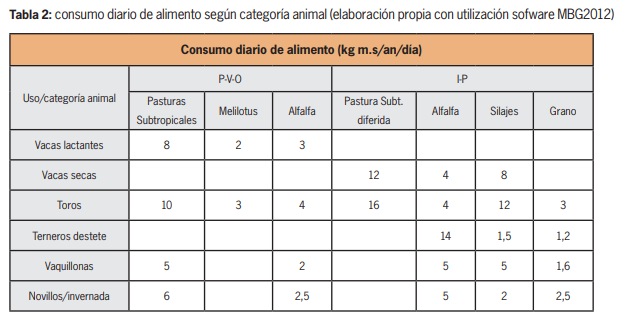 Un segundo paso, es calcular el consumo y las necesidades alimenticias de las diferentes categorías animales de acuerdo a la estructura forrajera existente, el mismo es influenciado por el % de Digestibilidad de la Materia Seca (M.S) y el nivel productivo requerido por los animales. En la tabla 2 se presenta el consumo en Kg de M.S/ día para cada una de las categorías animales del ejemplo. Para la realización de estos cálculos se necesita del asesoramiento y apoyo profesional con el uso de tablas de necesidades nutritivas del ganado y/o utilización de un software de nutrición.