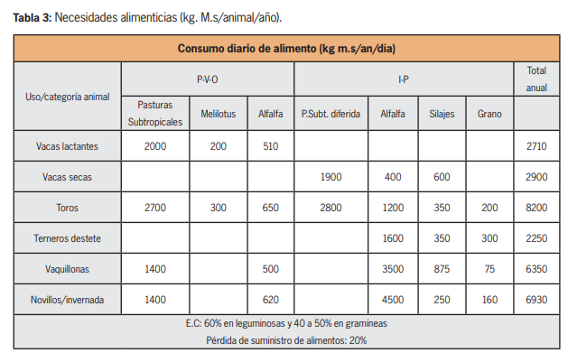 Luego se estiman las necesidades alimenticias totales del establecimiento (tabla 3) y la proyección para satisfacer las mismas a través de los diferentes recursos forrajeros producidos y disponibles en el establecimiento, habitualmente llamamos a esto “balance forrajero”. En este punto se debe considerar que la certeza de las estimaciones depende principalmente de la eficiencia en la aplicación de los planes de pastoreo y balance nutricionales.