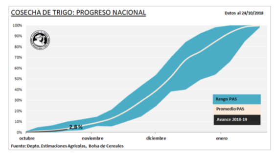 La campaña de trigo 2018/19 continúa con sus primeras cosechas en el norte del país, donde los rendimientos relevados mantienen una gran heterogeneidad en función del nivel de humedad registrado durante las etapas críticas del llenado de grano. A la fecha, el progreso nacional alcanzó el 2,8 % de la superficie apta, con un rinde medio nacional de 14,5 qq/Ha y un volumen parcial acumulado que superó las 250.000 toneladas. A su vez, la disminución en las expectativas de rendimiento que se relevaron sobre las regiones afectadas por los eventos de granizo y heladas, permitieron reducir la proyección de producción para el presente ciclo en 300.000 toneladas.