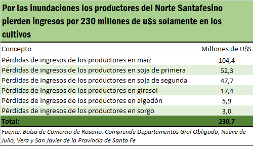 Los ingresos brutos que perderían de obtener los productores agropecuarios de los Departamentos de Nueve de Julio, Vera, General Obligado y San Javier (en la provincia de Santa Fe) como consecuencia del desastre meteorológico acaecido en las últimas semanas (lluvias e inundaciones) ascenderían a 230,7 millones de U$S.
