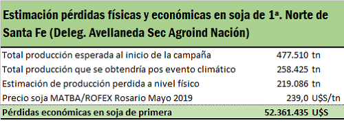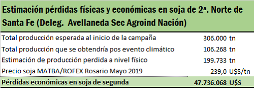 Según información de la Secretaría, la Delegación Avellaneda tenía un área de siembra prevista con soja de segunda en la campaña actual del orden de las 105.000 ha. El 50% de esa área se sembró entre el 13 de diciembre de 2018 y el 10 de enero de 2019. Se estima que por el evento meteorológico se habrían perdido cerca de 26.200 ha. Pero el área que soportaría el evento (las otras 26.200 ha) podrían llegar a tener un rinde menor de 18 qq/ha. Habrá que ver la evolución del clima en los próximos días para ver si se confirma estos supuestos.