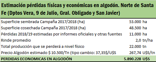 De acuerdo a informantes calificados, las pérdidas totales en algodón en esa zona alcanzarían las 11.000 hectáreas, lo que implica una pérdida de ingresos para los productores de 5,9 millones de U$S.