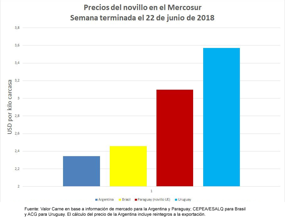 En los últimos diez días, la baja en la cotización en dólares del novillo argentino, pese a un aumento en pesos, sobresalió entre los movimientos del Mercosur.