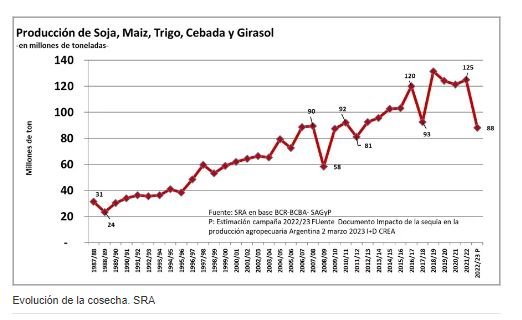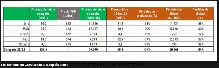 88/136. Según CREA, considerando los 5 principales cultivos, contra una previsión al inicio de la campaña 2022/2023 de 132,6 M/t, ahora se aguarda 88,1 M/t. Se trata de una merma del 34% en términos productivos o de 44,5 M/t en números absolutos. El volumen previsto por CREA será el más bajo desde 2011/2012, comprendiendo las últimas 11 campañas.