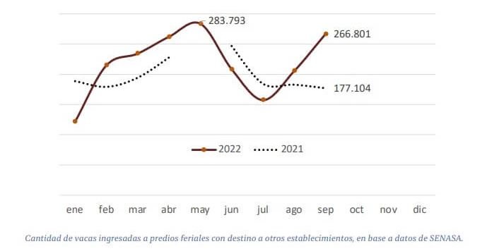Por otra parte, los datos oficiales permiten visualizar la sobreoferta que registra el mercado de vacas. De acuerdo al Servicio de Sanidad y Calidad Agroalimentaria (SENASA), en lo que va de 2022, ingresaron un 17% más de cabezas, en relación al mismo período del año pasado.