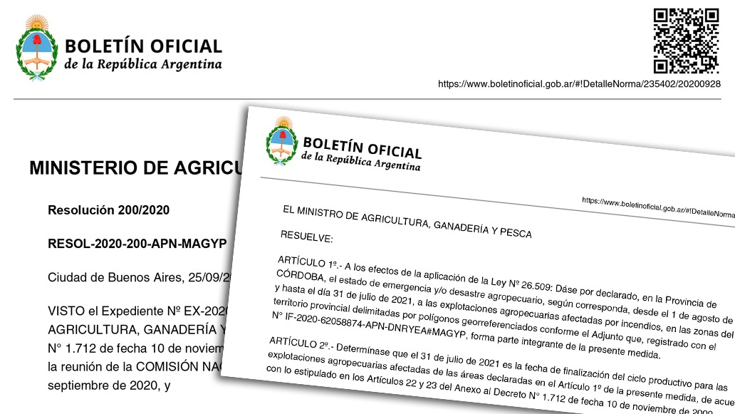 El Ministerio de Agricultura, Ganadería y Pesca de la Nación informa que hoy se publicó en el Boletín Oficial la declaración de emergencia y/o desastre agropecuario, según corresponda, desde el 1 de agosto de 2020 y hasta el día 31 de julio de 2021, a las explotaciones agropecuarias afectadas por incendios de la provincia de Córdoba.
