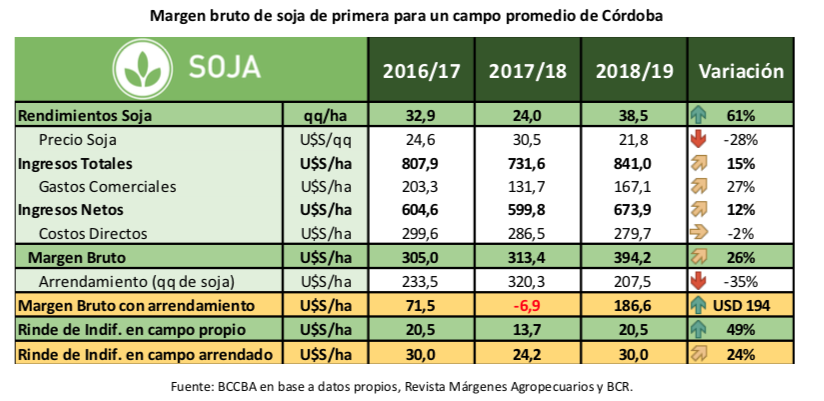 El margen bruto promedio en Córdoba para soja de primera en campo propio fue, en promedio, de USD 394 por hectárea en la campaña 2018/19, un 26% más elevado que el de la campaña previa. Si bien el precio de cosecha disminuyó en USD 87 por tonelada, este efecto fue contrarrestado por un incremento del rendimiento, aumentando los ingresos totales en 109 USD por hectárea.