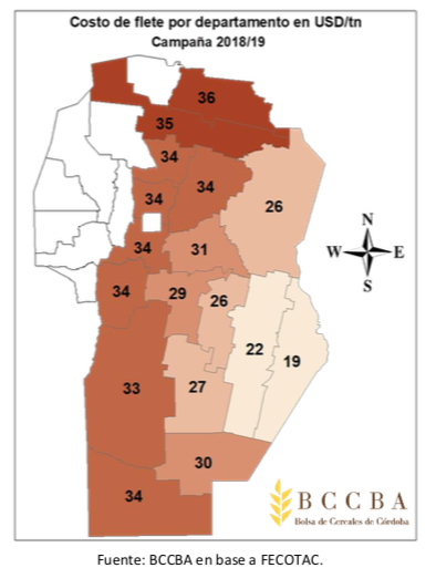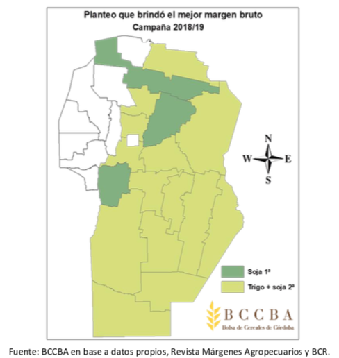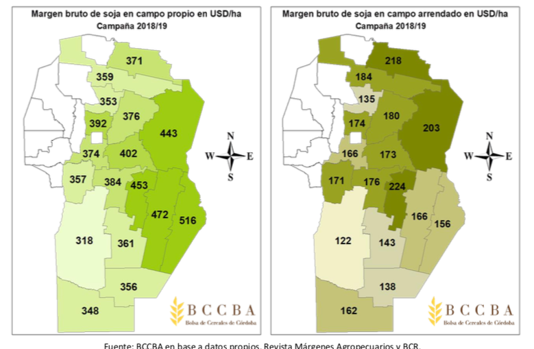 La provincia de Córdoba presenta una amplia variabilidad en lo que respecta a calidad de suelos, distancia al principal puerto de exportación y condiciones agrometeorológicas, por lo que la rentabilidad difiere entre zonas. Para la campaña 2018/19 el margen bruto para soja de primera en campo propio osciló entre USD 318 y USD 516 por hectárea. Los departamentos con mejores condiciones agrícolas, como General San Martín, Marcos Juárez y Unión, obtuvieron los resultados más elevados, tanto por buenos rendimientos como por su cercanía al puerto que reduce los costos de comercialización.