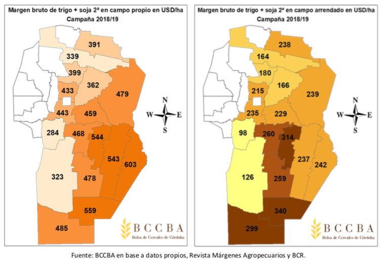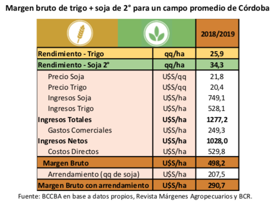 El resultado fue mejor para quienes a la hora de sembrar optaron por combinar trigo con soja de segunda, obteniendo un margen bruto promedio en Córdoba de USD 498 en campo propio y USD 291 en campo arrendado, valores más elevados a los planteos de soja de primera por 26% y 56% respectivamente.