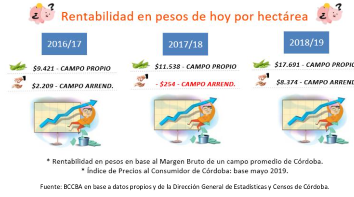 En particular, para comparar los márgenes de las distintas campañas en pesos, es necesario aislar los efectos que tiene la inflación sobre el poder de compra de la moneda local. Es decir, no vale lo mismo un peso que ganó un productor hace dos años, del que gano actualmente. Por lo tanto, utilizando el Índice de Precios al Consumidor de la provincia de Córdoba, se eliminó este componente y se igualaron los márgenes de las últimas tres compañas al poder adquisitivo del peso a mayo de 2019.