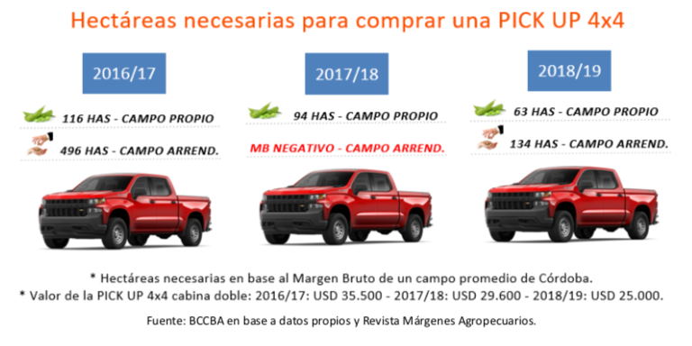 En el ejercicio de los dos bienes restantes se midió el poder de compra como cantidad de hectáreas necesarias para poder adquirirlos. En el caso de la camioneta Pick Up doble cabina se evidencia que en la campaña 2018/19 se requirió un equivalente al margen bruto de 63 hectáreas para su compra, 33% menos hectáreas que las necesarias durante la campaña anterior. En campo arrendado se precisaría un campo de 134 hectáreas para adquirir la camioneta, mientras que en la campaña 2017/18 su compra no sería posible para el campo promedio de Córdoba, debido a los márgenes brutos negativos. Las causas de estas variaciones obedecen, principalmente, a que el valor de la camioneta cayó en dólares.