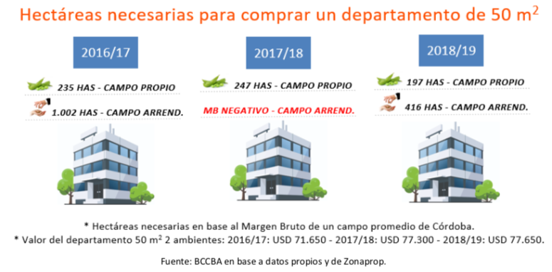 Finalmente, se observa que adquirir un departamento requirió 197 hectáreas para un campo propio en la campaña 2018/19, un 20% menos que en en la campaña previa, donde el monto se ubicaba en un equivalente al margen bruto de 247 hectáreas. Para el caso de un campo arrendado era imposible adquirir un departamento durante la campaña 2017/18 debido a los márgenes negativos, mientras que en la última campaña se precisaría un campo arrendado promedio de 416 hectáreas.