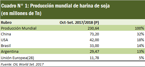 Uno de los grandes logros productivos de Argentina es precisamente éste. Nuestro país tiene una posición muy relevante como productor mundial de harina/pellets de soja. En el ciclo 2017/2018 según proyecciones de Oil World, nuestra Nación ocuparía el cuarto lugar a nivel mundial con una producción de casi 30 millones de toneladas (Mt) de harina y pellets. Argentina sería superada en este ciclo (de octubre 2017 a setiembre 2018) por China (con una producción de 73,2 Mt), Estados Unidos (42 Mt) y Brasil con 33 Mt.