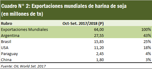 Los datos de Oil World pronosticados para la campaña 2017/2018 muestran –tal como ha sucedido en los últimos años- que Argentina vuelve a ser el principal exportador de harina y pellets de soja, con casi 28 millones de toneladas comercializadas en el exterior (Cuadro N°2). Le siguen Brasil con 15,8 Mt y luego Estados Unidos de América con 11,2 Mt. Argentina exporta el 43% del total de este mercado y entre nuestro país, Brasil y Estados Unidos –sumados- las tres nacionales atienden casi el 90% de la demanda internacional de harina y pellets de soja.
