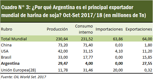En el cuadro N°3 –con las estimaciones de Oil World para el período 2017/2018- podemos ver que los tres principales productores de este bien tienen altos consumos internos, quedándoles poco excedente para exportar. Nos referimos a China, Estados Unidos y Brasil. El único caso de bajo consumo local es Argentina. En efecto, China produce casi 73 Mt de harina y pellets de soja, consumiendo en su propio mercado cerca de 71,4 Mt. Exporta la irrisoria cifra de 1,8 Mt. Algo similar sucede con Estados Unidos: produce 42 Mt, consume 31 Mt y exporta 11 Mt. Brasil produce 33, consume casi 18 Mt y su excedente exportable es de 15,8 Mt.
