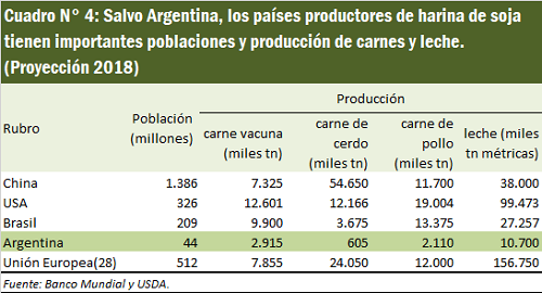 En el cuadro N°4 podemos observar las razones por las cuales todos los países productores de harina de soja –a excepción de Argentina- tienen altos consumos internos de este producto. En primer lugar por la magnitud poblacional y –por ende- sus fuertes demandas de proteína animal. Y además porque tienen estrategias integradas de exportación de carnes.