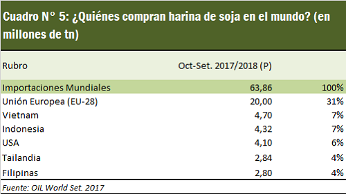 El cuadro N°5 muestra el ranking de países importadores de harina de soja en el mundo. Se observa que la Unión Europea lidera las importaciones de harina/pellets de soja con un volumen total de 20 millones de toneladas, esto representa un 31% del total importado a nivel global (63,83 Mt). El resto de los países importadores participan con un volumen de compra significativamente menor que fluctúa entre 2,8 y 4,7 millones de toneladas.
