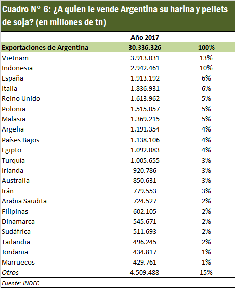 Indicador/ pregunta N°6: ¿Quiénes compran en el mundo harina de soja/pellets y quienes le compran a Argentina? ¿Son pocos compradores? ¿Peligran nuestras exportaciones?