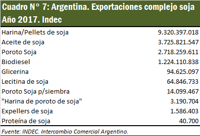 Las exportaciones del complejo oleaginoso (soja más girasol) ascendieron el año pasado a casi 18 mil millones de US$. En consecuencia, el 31% del total de las exportaciones de Argentina en el 2017 fue generado por la producción de soja y girasol y su industrialización posterior. Recordemos que las exportaciones de bienes de argentina fueron en el 2017 de 58.400 millones de U$S. Como vimos en otras notas de este informativo, uno de cada tres dólares que entran a Argentina por exportaciones, lo aporta la soja y el girasol.