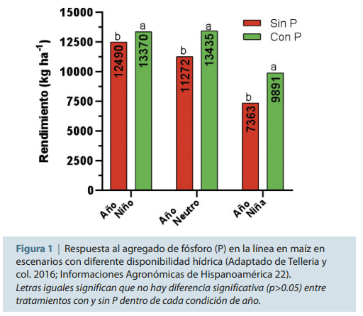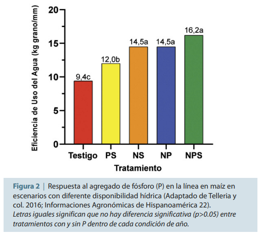 Los rendimientos del cultivo de maíz se han incrementado en los últimos 60 años (107 kg/ha/año). Sin embargo, aún existe una brecha entre los rendimientos actuales y los alcanzables en condiciones de secano. Estas brechas, del 30 al 40%, se deberían a múltiples causas, desde la salud del suelo hasta las prácticas de manejo del cultivo como la fertilización. Los balances de nutrientes en maíz han sido históricamente negativos en Argentina, es decir que la remoción en granos supera a la aplicación. Asimismo, numerosas investigaciones en distintas zonas del país han demostrado que la aplicación de nutrientes deficientes en los sistemas de producción permite incrementar los rendimientos hasta un 69% por sobre los actuales. Por este motivo, se considera que parte de la brecha de rendimientos está relacionada con la “brecha de nutrientes”, definida como la diferencia entre los nutrientes actualmente aplicados y aquellos necesarios para lograr los rendimientos alcanzables. La campaña agrícola 2022/23 se caracteriza por una probabilidad del 80% de que se presente una fase Niña, lo cual limitaría la disponibilidad de agua para el cultivo de maíz en las principales zonas productores del país. A este panorama se suma la muy baja disponibilidad de agua útil en el perfil previo a la siembra del cultivo. Frente a este panorama, surge la pregunta de ¿Por qué fertilizar el maíz en un año Niña? Si bien en años con baja disponibilidad hídrica, la respuesta a la aplicación de nutrientes deficientes como el nitrógeno (N) y azufre (S) pueden ser más bajas, aumentos en la disponibilidad de agua durante el período crítico pueden incrementar la respuesta debido al menor aporte por mineralización hasta dicho momento. Respecto a fósforo (P), cuando la disponibilidad es baja, la respuesta al agregado del mismo es mayor en un año seco que en un año húmedo. Se han observado incrementos de rendimiento de hasta 2528 kg/ha (+34%) para un año Niña y de 880 kg/ha (+7%) para un año Niño (Figura 1). Trabajos realizados en laregión pampeana núcleo han observado mejoras de 28%, 55%, 55% y 73% en la eficiencia de uso del agua por efecto de la fertilización con PS, NS, NP y NPS, respectivamente (Figura 2). Por lo tanto, la fertilización basada en un diagnóstico correcto permitiría maximizar el aprovechamiento del agua, un recurso escaso en un escenario de gran incertidumbre.