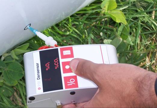 La otra forma de controlar el estado de los granos almacenados es mediante el monitoreo con equipos de medición de CO2, que se basa en la baja permeabilidad de la bolsa plástica al pasaje de gases y en la respiración del grano asociada con los microorganismos, lo que produce un incremento en la concentración de CO2 y una reducción en la concentración de O2 sobre todo con grano húmedo, ya que estos producen mayor actividad biológica. Esta tecnología permite localizar áreas o focos de alteración en plazos no superiores a los 7 días de almacenamiento. Los equipos permiten sectorizar la bolsa y localizar el problema previo al deterioro de los granos, con una alta sensibilidad y sin dañar la integridad del plástico, ya que para la medición se introduce una pequeña aguja hipodérmica al tomar la muestra, esto le permite a un solo operario evaluar entre 15 a 20 bolsas en una hora.