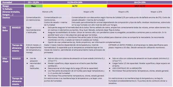 A continuación, se detalla una guía sintetizada en dos tablas sobres riesgos y manejos de grano húmedo, las mismas son de carácter orientativo, dado la gran cantidad de variables que intervienen durante el almacenamiento.