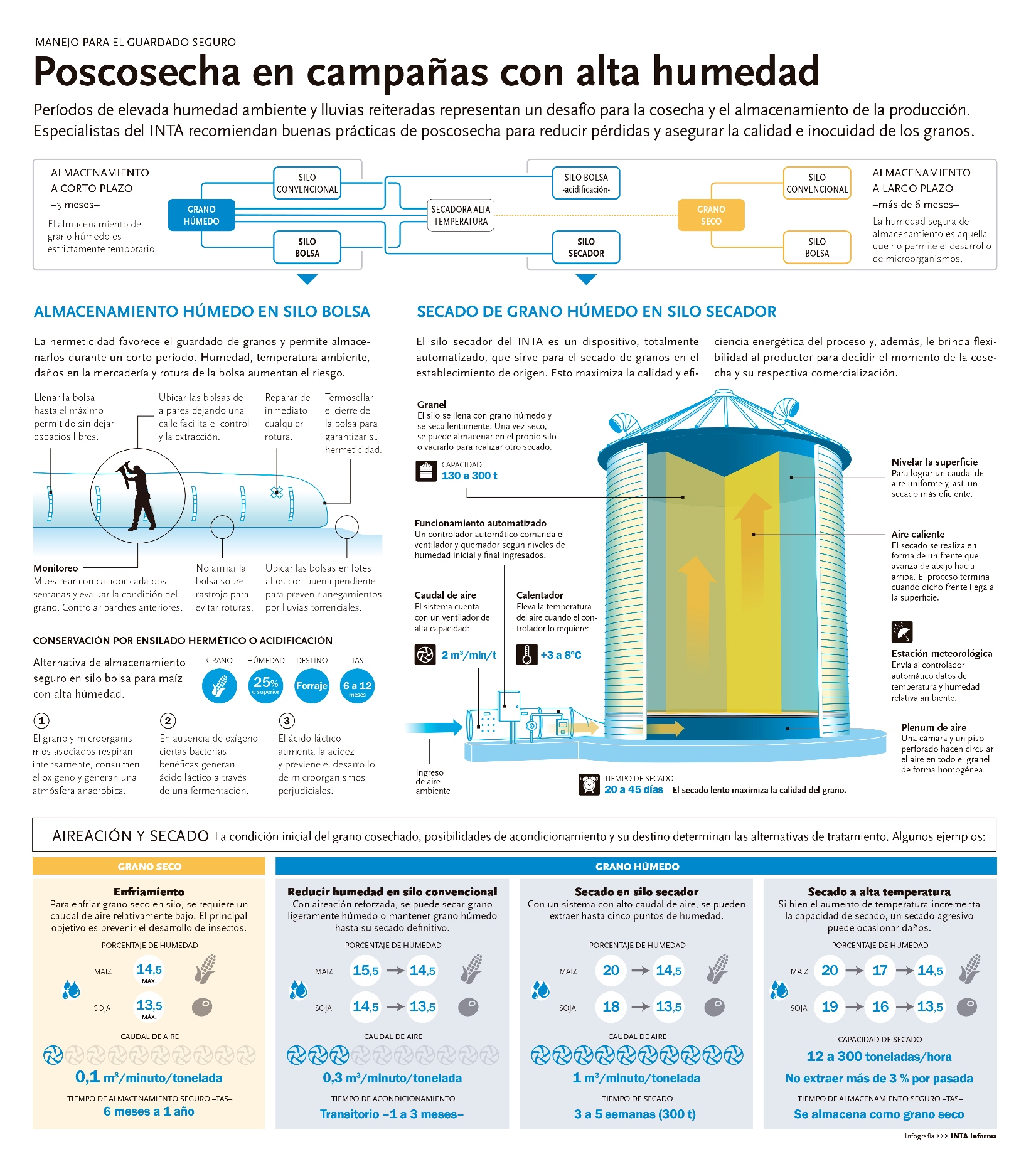 Para determinar el tipo y el tiempo de almacenamiento es fundamental conocer el porcentaje de humedad que contiene cada grano, además de las condiciones ambientales y las posibilidades que tenga el productor de utilizar el sistema de aireación.