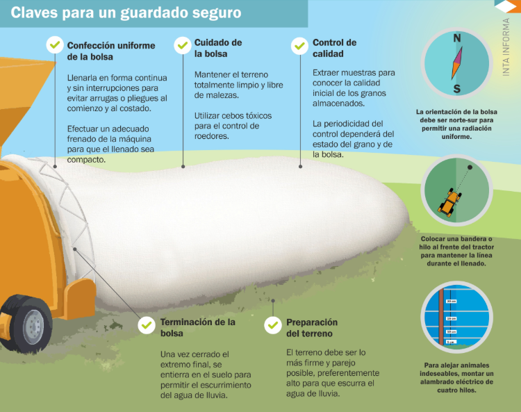 El lugar donde armar la bolsa es otro de los factores a tener en cuenta. “Debe ser un lugar alto y con leve pendiente”, indicó el técnico del INTA quien señaló que es importante tener en cuenta que, cuando llueve frecuentemente, se producen encharcamientos temporarios en el lote y el agua puede ingresar por pequeñas perforaciones en la base de la bolsa. “Esto puede producir fermentación de los granos y lentamente podría afectar el resto del material almacenado”, agregó.