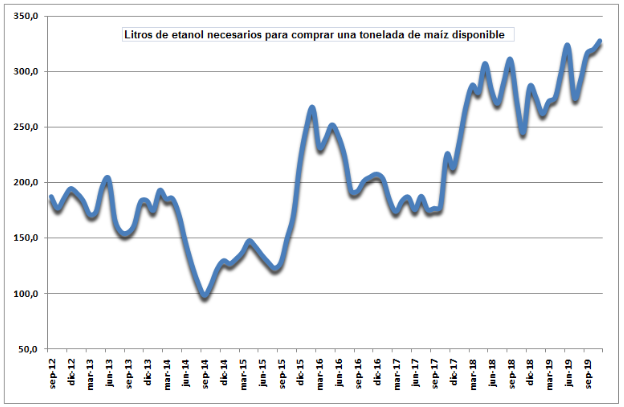Con el valor promedio del maíz disponible Rosario registrado en lo que va de noviembre (8709 $/tonelada), se requieren 327 litros de etanol para adquirir una tonelada del cereal versus 245 y 225 litros en el mismo mes de 2018 y 2017 respectivamente.