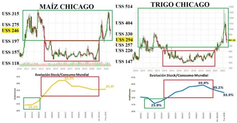 La relación “stock final mundial/consumo mundial de granos” es uno de los indicadores más seguidos por el mercado para resumir la situación fundamental de los granos. El stock final mundial de granos habla de la oferta física en existencia en los diferentes países del mundo de una campaña determinada, cuando ingresan los primeros granos de la nueva campaña. Es decir que cuantifica el volumen de granos que sobra de una campaña, mientras ingresa el grano nuevo de la siguiente. El consumo mundial de granos explica el volumen proyectado a consumir durante cada campaña. El cociente entre el stock y el consumo mundial de granos permite conocer a cuanto volumen del total de granos que serán consumidos en una campaña. Equivale el volumen de stock remanente que pasará a la siguiente, para deducir el grado de amenaza que podría representar un recorte productivo durante la campaña siguiente. En resumen, la relación stock/consumo muestra una proporción que representa un seguro de oferta física en caso de fallas productivas que podrían ocurrir la campaña siguiente. Por tanto, a mayor relación stock/consumo, menor amenaza ante fallar productivas de determinado grano. Es oportuno observar la evolución de la relación stock/consumo de soja, maíz y trigo desde la campaña 10/11 hasta la 22/23 y su relación con los precios históricos de estos tres granos en Chicago.