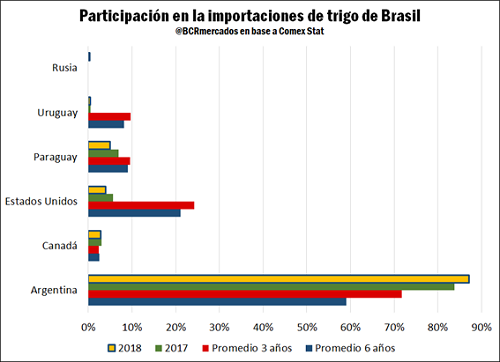 A partir los datos finales para el año 2018, obtenidos a través del portal Comex Stat que depende del Ministerio de Industria, Comercio Exterior y Servicios del Gobierno de Brasil, se corrobora el protagonismo de Argentina como abastecedor del cereal. Nuestro país vecino importó 6.817.138 toneladas de trigo en el año 2018, un 13,2 % más que lo importado en 2017.