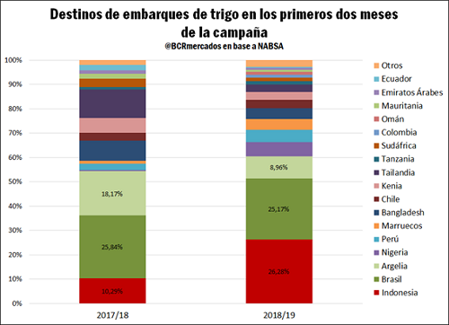 Se destaca el crecimiento de los envíos a Indonesia, que pasaron de representar el 10,3 % al 26,3 % del total para este período que, se reitera, es de sólo mes y medio. Este incremento se debe a la sequía que afectó a la producción de Australia, país naturalmente oferente del cereal en el sudeste asiático. Según el USDA, la cosecha 2018/19 estaría en 17 millones de toneladas, 4,3 menos que las obtenidas en la campaña anterior. La cifra coincide con el número de ABARES, ministerio de agricultura y recursos naturales de Australia, que, por otra parte, pronosticó que las exportaciones del 2018/19 tocarían el mínimo en 10 años con 10,6 Mt.