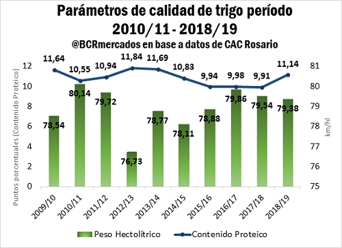 Los análisis sobre las 1.500.000 toneladas de muestras recibidas por la Cámara Arbitral de Cereales de Rosario entre el 12/11/2018 y el 12/01/2019 arrojaron un promedio de 11,14% de contenido proteico. De estas muestras, alrededor de 700.000 toneladas corresponden a trigo comercializado de origen santafesino. El contenido proteico es clave comercialmente ya que un alto nivel proteína se asocia con una buena cantidad de gluten.