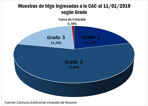 Los resultados de los análisis realizados sobre las muestras ingresadas a la Cámara Arbitral de Cereales de Rosario al 11/01/2019 (ver gráfico) se distribuyen de la siguiente manera: 21.3% es Grado 1, 56.8% es Grado 2, 21.2% es Grado 3 y, finalmente, el 0.7% de las muestras se consideran fuera de estándar. El contenido de proteínas impacta comercialmente en bonificaciones y rebajas.