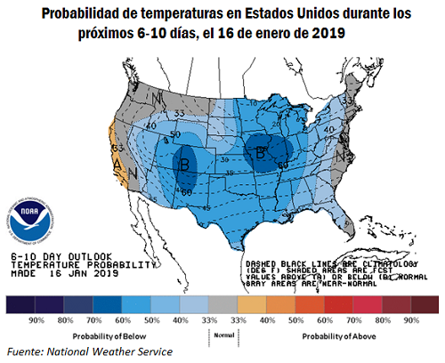 Aunque la trayectoria específica y la intensidad de la tormenta son inciertas, la guía del modelo es consistente en un flujo de aire frío del Ártico que se mueve detrás de esta tormenta. Entre sábado y martes próximos, las temperaturas probablemente oscilarán entre 10 ° y 20 ° F (6 a 12 grados Celcius aproximadamente) por debajo de lo normal en toda la parte central y oriental de los Estados Unidos en algún momento. El trigo de invierno en dormancia, sin cobertura de nieve, puede dañarse cuando las temperaturas descienden por debajo de -23 ° C durante un período prolongado, lo que podría ocurrir en las Dakotas en las mañanas del 19 al 21 de enero.
