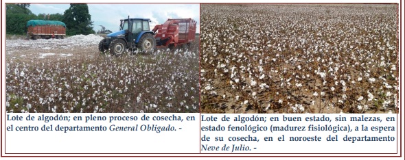 Zonas este-oeste: entre tres y cuatro días, según zonas, continuó firme el avance del proceso de cosecha, favorecido por las condiciones climáticas de buen tiempo que se vieron interrumpidas por las precipitaciones registradas. No cambió la realidad enunciada en el informe anterior acerca de la entrega de la cosecha, las desmotadoras continuaron recibiendo fibra con cupos limitados, generando complicaciones y demoras para el sector productivo.
