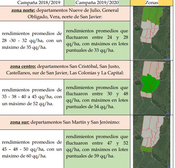 El proceso de cosecha continuó muy firme en los departamentos del sur del área de estudio, San Jerónimo y San Martín, con mejoras en los rendimientos enunciados en la semana anterior y revirtiendo lo que fue en un principio de la recolección. Se mantuvieron sin variabilidad desde muy buenos a regulares y malos, pero heterogéneos en la distribución geográfica. En promedio, con mínimos de 25 a 28 qq/ha y máximos de 35 a 38 qq/ha, con cuadros puntuales de 42 a 45 qq/ha.