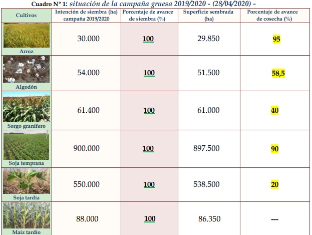 Las tareas efectuadas en la semana fueron: a) monitoreo de trampas para capturas de picudos, en predios destinados al cultivo de algodón, b) aplicación de reguladores de crecimiento en los cultivares de algodón, c) monitoreo y seguimiento de los cultivares de soja tardía, d) monitoreo y seguimiento de los cultivares de maíz tardío, e) cosecha de arroz, f) cosecha de algodón, g) cosecha de soja temprana, h) cosecha de sorgo granífero, i) cosecha de soja tardía, 3 j) cosecha de maíz tardío, picado-embolsado, autoconsumo. Para el período comprendido entre el miércoles 29 al martes 05 de mayo de 2020, los pronósticos prevén desde su inicio, condiciones de estabilidad climática, temperaturas medias diarias estables, sin marcadas variaciones, acordes a la época del año, hasta mediados del lunes 04. A posteriori, un aumento de la nubosidad e inestabilidad comenzarían a registrarse en el centro – norte del área, que con el transcurso de las horas cubrirían toda el área del SEA.