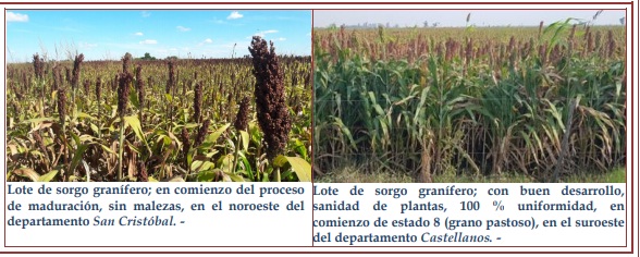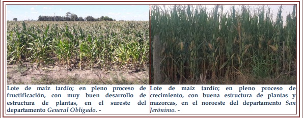 En el caso del destino a grano comercial, los maizales avanzaron normalmente y sin mayores inconvenientes. Se observó que los sembrados tempranos presentaron estados buenos, pero los tardíos continuaron siendo muy diferentes, no lograron una recuperación en el desarrollo, tanto de las plantas como foliar, hechos que se reflejarían en una disminución de los qq/ha finales obtenidos. Se observaron los siguientes estados fenológicos: en V “estados vegetativos”, V6 (6º hoja desarrollada), V7 (7º hoja desarrollada), V8 (8º hoja desarrollada), V9 (9º hoja desarrollada), R “estados reproductivos” R1 (emergencia de estigma), R2 (cuaje, ampolla), R3 (grano lechoso) y lotes más avanzados, en R4 (grano pastoso).