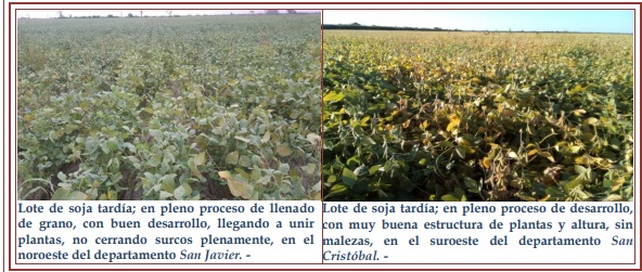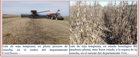 Con un grado de avance de la trilla del orden del 20 %, con un adelanto de 2 puntos porcentuales en comparación a la campaña anterior, en similar período. Un 55 % de los lotes se observó en estado bueno a muy bueno, con predios puntuales a excelentes, un 20 % en estado bueno a regular, con mediano desarrollo de estructura de plantas, no llegando al cierre de los surcos, un 20 % regular y un 5 % malo. Se observaron, los siguientes estados fenológicos: R “estados reproductivos”, R3 (vaina de 5 mm de longitud en nudo), R4 (vaina de 20 mm de longitud en nudo), R5 (comienzo de llenado de semilla en nudo, semilla de 3 mm de longitud), R6 1 (semilla verde de tamaño máximo del nudo), en R7 (comienzo de madurez, una vaina con color de madurez) y en lotes más avanzados, en R8 (madurez plena)
